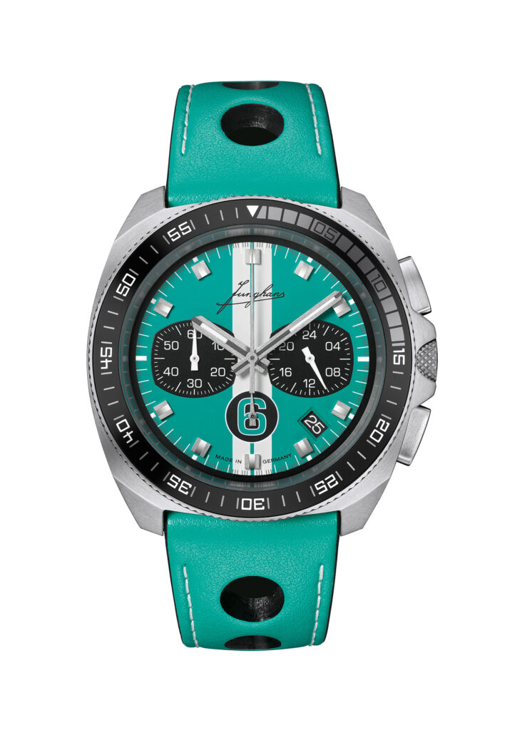 Zur Sportlichkeit gesellt sich ein hochwertiger Auftritt mit einem markant gestalteten Gehäuse und vielen feinen Details, zum Beispiel die gegen den Uhrzeigersinn drehbare Lünette sowie Krone und Drücker, die die Gehäuselinie aufnehmen. Die Zifferblätter tragen ein mattes Finish und einen farblich abgestimmten Doppelstreifen in der Mitte. Die blaue und grüne Zifferblattvariante erhält dynamische, weiße Doppelstreifen in der Mitte, bei der orangen Variante ist der doppelte Längsstreifen schwarz lackiert. Alle Zifferblätter zeigen an der passenden Position die Ziffer 6 in Form einer Startnummer. Das historische Logo auf dem Zifferblatt weist auf die traditionelle Verbundenheit von Junghans zum historischen Motorsport hin. Das zeigt sich auch bei der Gestaltung der farblich abgestimmten Lederbänder, die im Stil traditioneller Sportfahrerhandschuhe gelocht sind.